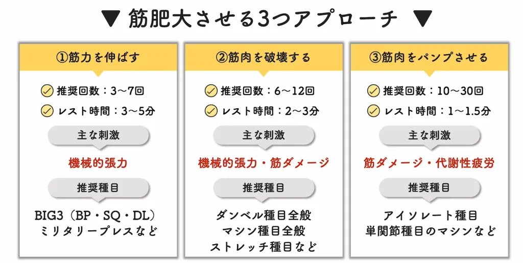 図に示された3つのアプローチは、それぞれの刺激を最大化するために、反復回数、休憩時間、種目の選択が整理されています。本稿では35歳以上の男性向けに、この3アプローチを現実的なメニューへ落とし込み、無理なく“太く強く”を積み上げる方法を解説します。